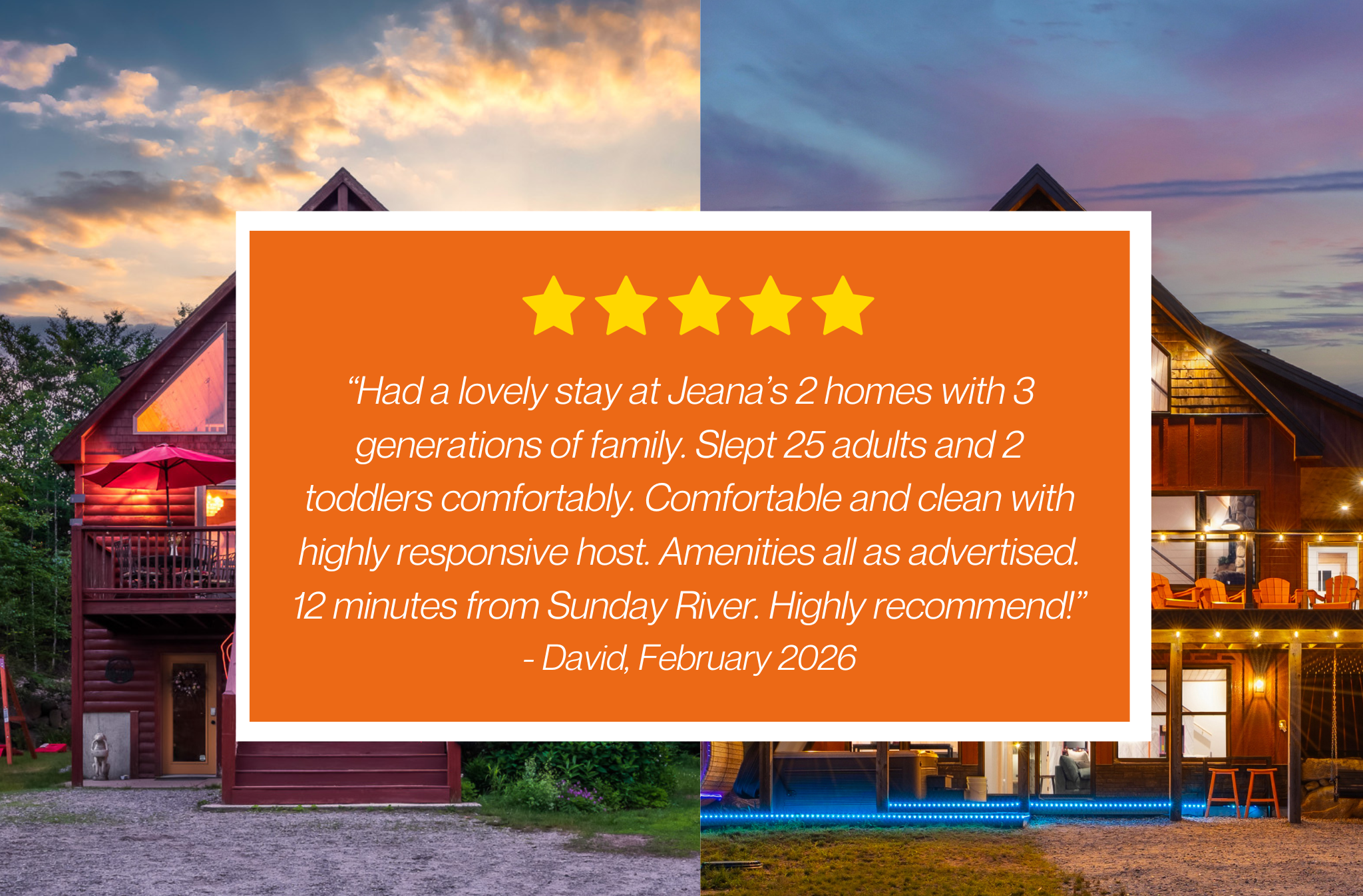 "We especially LOVED the sauna hot tubs and the large table on the deck which had room for all of us! Also, the houses are closer together than you may think (a minute walk) so great for 2 families or groups of friends. This home would be great to rent again in any season!" - Sarah, Sept 2025 NEW listing combining two homes that sleep up to 29, just 2 minutes apart by car, offering privacy while keeping your group connected. (You can walk from one chalet to another in just a few minutes.) Each has individually earned many 5 star reviews, providing its own unique charm. We welcome family reunions, retreats, and micro weddings for up to 29 total attendees when both properties are booked together. Group gatherings exceeding this limit cannot be accommodated. "These cabins were perfect. Everything was perfect for our big family gathering. The homes were kept up very nice and each space was well designed for gathering and good vibes. We all loved it!" - Sam, Oct. 2025 ~ PRIME LOCATION ~ 📍Quiet neighborhood just 5 mins from shops & restaurants in Bethel Village 📍12 minutes from Sunday River for skiing, golfing and more 📍9 minutes from Mt. Abram for winter activities & mountain biking 📍Ample parking ~EXPERIENCE AT A GLANCE~ CRIMSON HIDEAWAY – Cozy & Stylish Chalet (Sleeps 16) A brand-new, thoughtfully designed chalet with breathtaking panoramic views and top-tier amenities. ✔ 5 Bedrooms | 3.5 Baths | Sleeps 16 ✔ Wrap-Around Deck with panoramic Mountain Views ✔ Hot Tub, Barrel Sauna, BBQ Grill, Outdoor Dining & Fire Pit ✔ Children’s Playground, Frisbee Golf & Cornhole ✔ Game Room with Arcade Games, Pool Table, Ping Pong, Air Hockey & Popcorn Station ✔ Fully Equipped Chef’s Kitchen & Dining Area ✔ Open-Concept Living Room with Fireplace, 7 Smart TVs & 1 King Bed 35 HIDEAWAY– Modern Mountain Retreat (Sleeps 13) A stunning, modern lodge-style chalet featuring expansive windows, sleek interiors, and cozy mountain vibes. ✔ 4 Bedrooms | 3 Baths | Sleeps 13 ✔ Hot Tub, Hang-Out Space, BBQ Grill & Outdoor Dining ✔ Egg Chairs, Swing Set for Children, Fire Pit & Cornhole ✔ Game Room with Arcade Games, Air Hockey & Karaoke ✔ Fully Equipped Chef’s Kitchen & Dining Area ✔ Spacious Living Area with Fireplace, 4 Smart TVs & 1 King Bed Prioritizing guest safety, this retreat features smoke and carbon monoxide detectors, fire extinguishers, propane gas alarms, and a professionally installed playground with 9 inches of protective pine bark mulching to enhance child safety. 🛌 ROOM & BED DETAILS 35 Hideaway - Sleeps 13 * Main Floor: Primary King-size suite -Sleeps 2 * Upper Floor: - Queen bed - Sleeps 2 - Bunk room: Twin over Full +Twin over Twin bunks - Sleeps 5 * Basement: Queen + Twin over Twin bunk bed - Sleeps 4 * 3 full bathrooms Crimson Hideaway - Sleeps 16 * Main Floor: Primary bedroom with a King bed - Sleeps 2 * UPPER FLOOR: - Queen Canopy bedroom - Sleeps 2 - Double Queen bedroom - Sleeps 4 * Basement: - Queen bedroom - Sleeps 2 - Custom bunk room (2 Twins and 2 Queens) - Sleeps 6 * 3.5 full bathrooms 💼 CONCIERGE SERVICES Elevate your stay with our concierge services! ✅ Relaxing at-home massages and facials ✅ Firewood delivery ✅ Private chef and catering experiences ✅ Fresh flowers delivery & celebration surprises before your arrival You'll receive details upon booking completion. Book Hideaway Havens today and experience the perfect blend of year-round adventure, relaxation, and luxury! *⚠️ PLEASE NOTE 🕒 Instant Booking If you’re new to Airbnb without reviews, reach out before booking—we’d love to connect first. 📝 Rental Agreement, ID & Security Deposit Hold This property has special local compliance requirements which include a signed rental agreement and the booker’s ID verification. Guests must either opt in for a $75 non-refundable damage waiver provided by a third-party insurance company, OR authorize a refundable temporary $1,200 security deposit hold–not a traditional security deposit, not an actual charge, released if no damage/excessive cleaning! (For stays longer than 10 nights, the optional damage waiver is $75 for stays up to 10 nights, with an additional $3 per day, or Guests can authorize a refundable temporary $2,000 security deposit hold.) To make this process easy for you, we use a secure and very simple, app-free platform called Happy Guest. It is not an app, and you do not have to sign up for an account -- it’s a safe and secure website. It also gives you a guest portal with all the info about the home and all of our favorite local spots. 🐾 Vacationing With Pets * Up to 2 house-trained dogs of non-aggressive breeds, ages 2 or older in each property. (Sorry, no cats or any other animals!) * Pet Fee $200 for up to 2 dogs per property. $400 total excluding platform fees if dogs are are present in both properties. * Pet approval required with proofs of recent rabies shot and vet-grade flea/tick medications, and Pet Rules apply. * Be sure to add the number of pets in your booking request (Under Guests>Scroll down to Pets) so the Pet Fee for up to 2 dogs for the entire stay is included in your booking amount. * Each property provides a 24”x36” kennel, 2 dog bowls and poop bags. 💍 WEDDINGS, RETREATS & CELEBRATIONS We welcome intimate weddings, retreats, and special gatherings across both houses. Events should stay within our maximum guest capacity of 29 including both properties, and additional fees or policies may apply based on group size and details. Contact us for more information. ******** 🌲Things to Do Nearby • Sunday River Resort – skiing, snowboarding, lift rides • Mt. Abram - skiing, boarding, mountain biking • Grafton Notch – hiking trails and scenic views • Step Falls Preserve – gentle hikes and waterfalls • Frenchman’s Hole – clear swimming hole • Bethel Outdoor Adventure – river floats, kayaks, and more • Sunday River Golf – mountain-view golf course • Ma