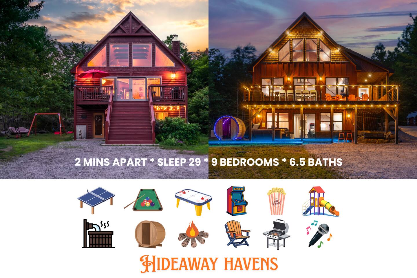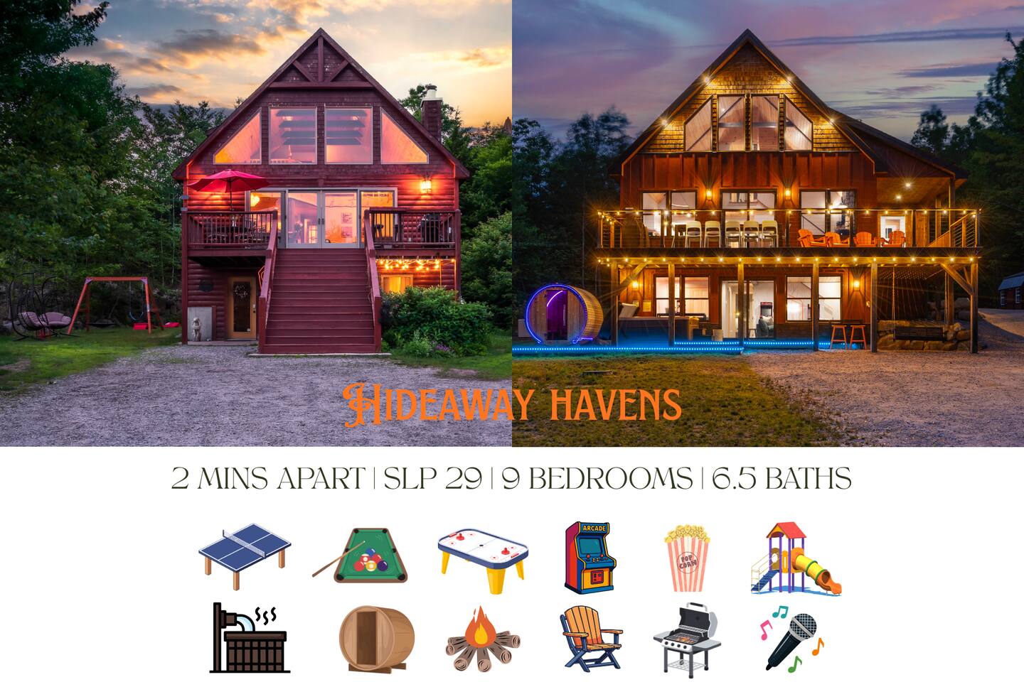Escape to Hideaway Havens in Bethel—two stunning chalets just 2 mins apart on a peaceful street, close to skiing, dining & outdoor fun. Sleeps 29. Embrace breathtaking mountain views, soak in 2 hot tubs, relax in a barrel sauna, roast s’mores at 2 fire pits, and play in game rooms with arcades, pool table, air hockey, ping pong & karaoke. Enjoy fireplaces, king beds, chef’s kitchens, BBQ grills, children's swing sets & more. Baby, kid & pet-friendly. Make magical mountain memories together.