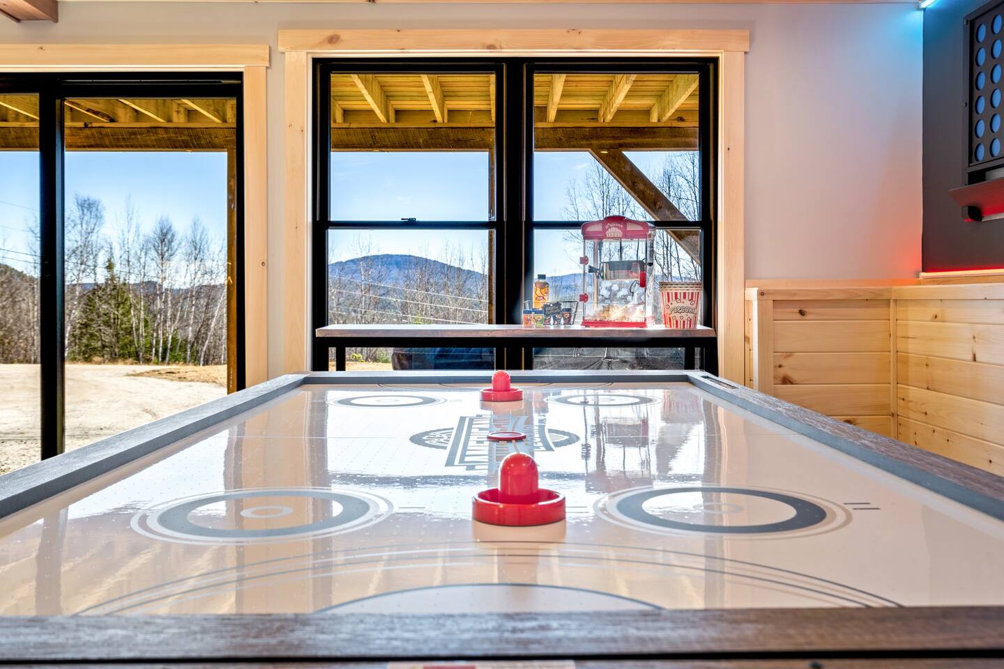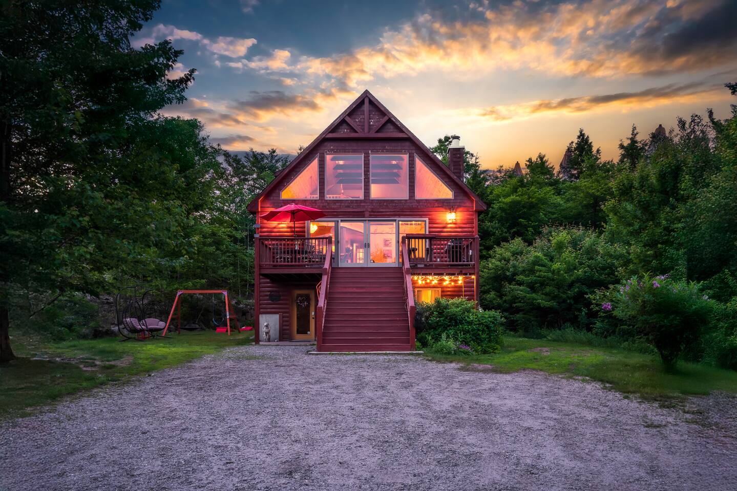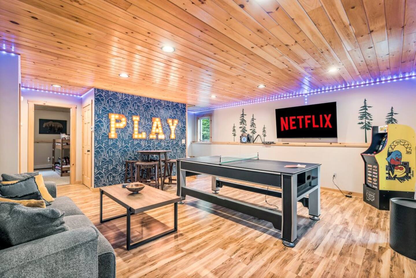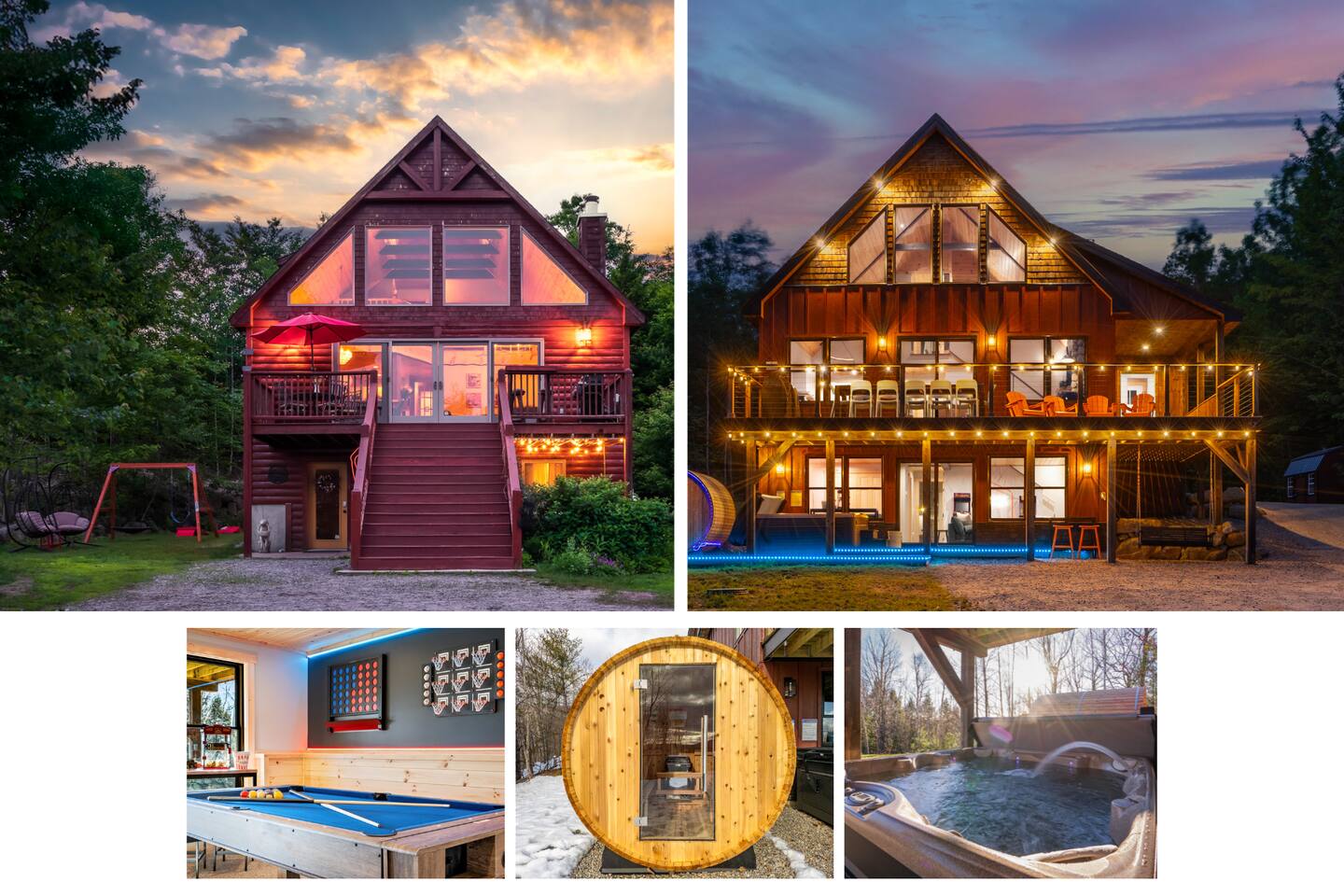 Escape to Hideaway Havens in Bethel—two stunning chalets just 2 mins apart on a peaceful street, close to skiing, dining & outdoor fun. Sleeps 29. Embrace breathtaking mountain views, soak in 2 hot tubs, relax in a barrel sauna, roast s’mores at 2 fire pits, and play in game rooms with arcades, pool table, air hockey, ping pong & karaoke. Enjoy fireplaces, king beds, chef’s kitchens, BBQ grills, children's swing sets & more. Baby, kid & pet-friendly. Make magical mountain memories together.