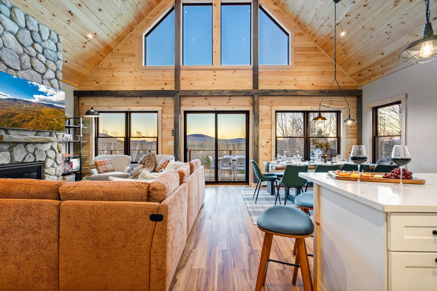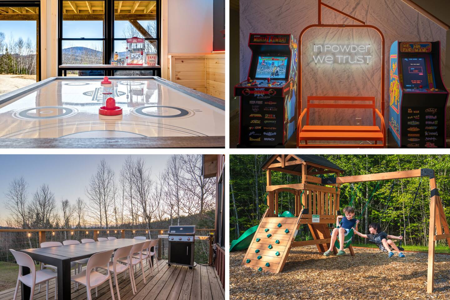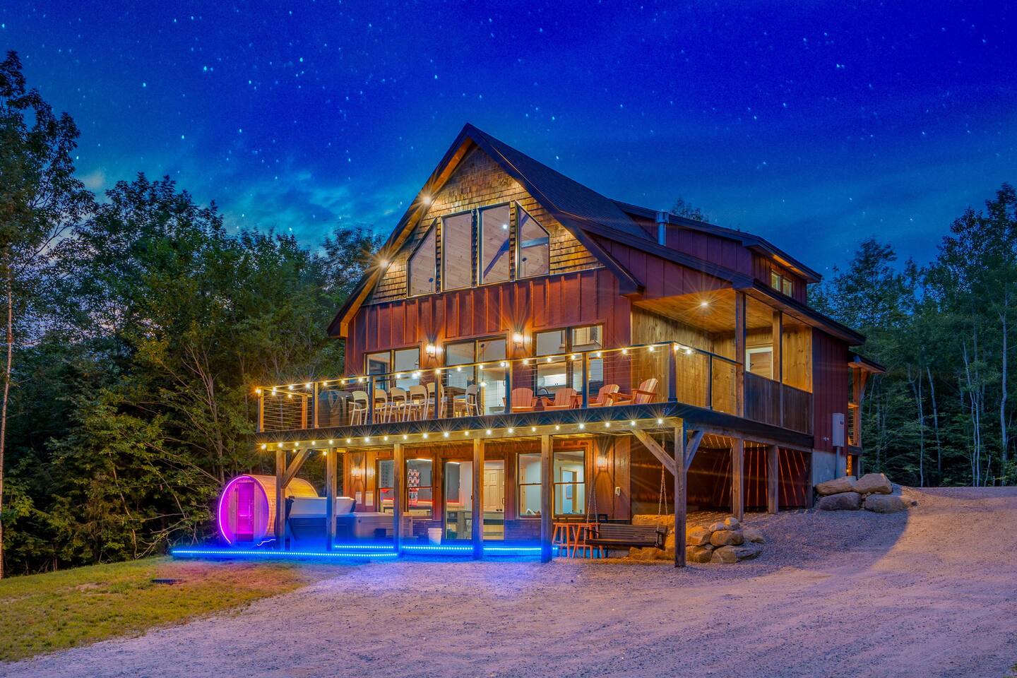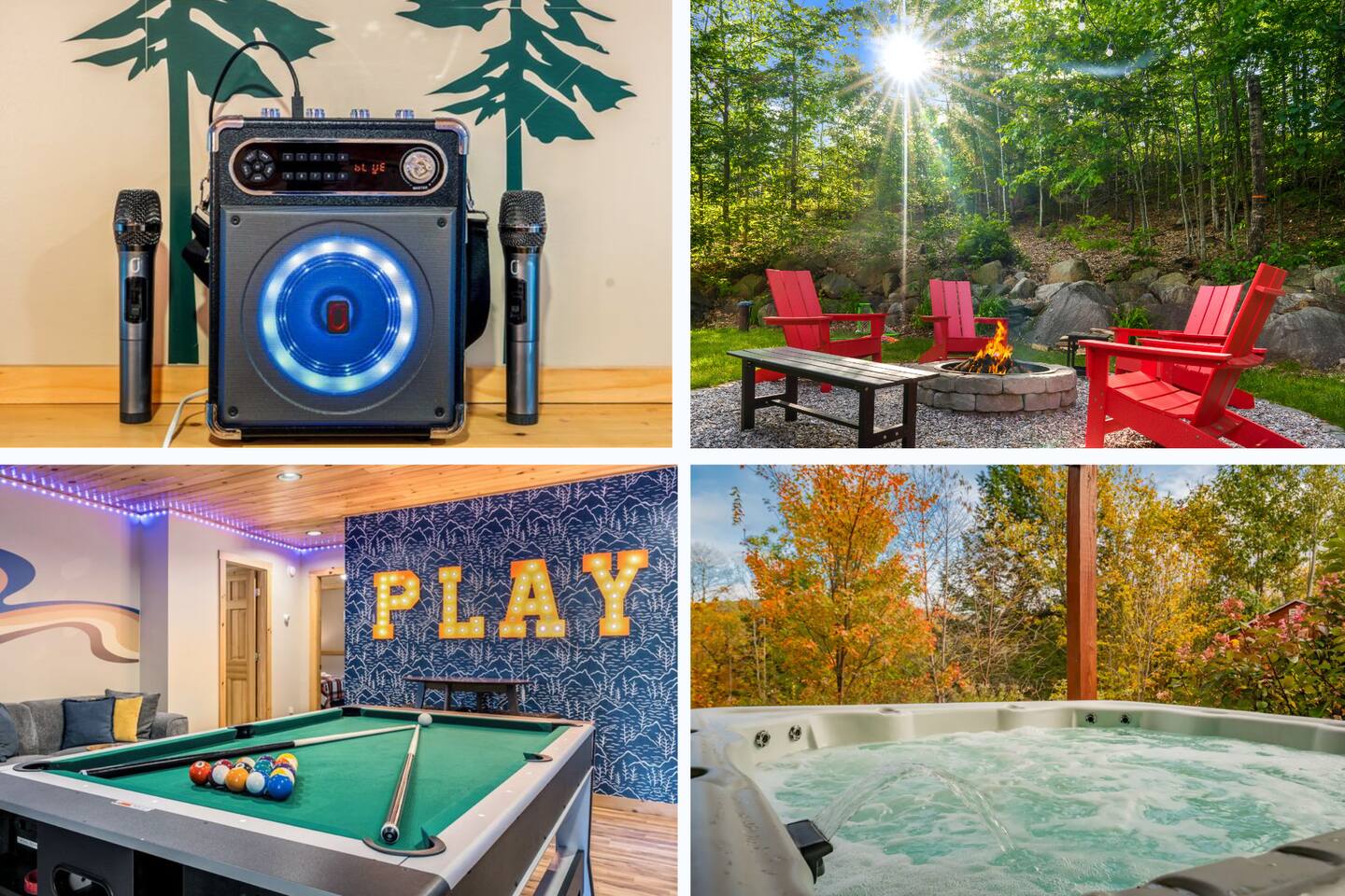 Escape to Hideaway Havens in Bethel—two stunning chalets just 2 mins apart on a peaceful street, close to skiing, dining & outdoor fun. Sleeps 29. Embrace breathtaking mountain views, soak in 2 hot tubs, relax in a barrel sauna, roast s’mores at 2 fire pits, and play in game rooms with arcades, pool table, air hockey, ping pong & karaoke. Enjoy fireplaces, king beds, chef’s kitchens, BBQ grills, children's swing sets & more. Baby, kid & pet-friendly. Make magical mountain memories together.
