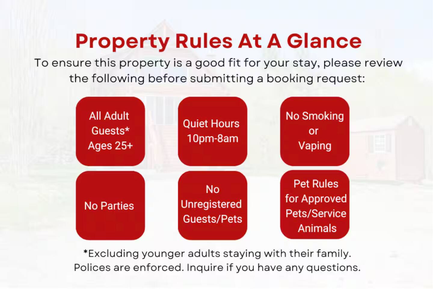 Questions? Email us at hideawayhavens@gmail.com ~Rental Agreement, ID & Security Deposit Hold~ This listing has special local compliance requirements which include a signed rental agreement and the booker’s ID verification. Guests are required to either authorize a refundable temporary $1,200 security deposit hold (not a traditional security deposit, not an actual charge, released if no damage/excessive cleaning), OR opt in for a $75 non-refundable damage waiver provided by a third-party insurance company. The optional damage waiver is $75 for stays up to 10 nights, with an additional $3 per day for stays longer than 10 nights. To make this process easy for you, we use a secure and very simple, app-free platform called Happy Guest. It is not an app, and you do not have to sign up for an account -- it’s a safe and secure website. It also gives you a guest portal with all the info about the home and all of our favorite local spots. ~Vacationing With Pets~ * Up to 2 house-trained dogs of non-aggressive breeds, ages 2 or older in each property. (Sorry, no cats or any other animals!) * Pet Fee $200 for up to 2 dogs per property. $400 total if dogs are are present in both properties. * Pet approval required with proofs of recent rabies shot and vet-grade flea/tick medications, and Pet Rules apply. * Be sure to add the number of pets in your booking request so the Pet Fee for up to 2 dogs for the entire stay is included in your booking amount. * Each property provides a 24”x36” kennel, 2 dog bowls and poop bags. Guess can access both properties entirely. For safety and property protection, guests are required to follow occupancy limit for each house's interior space: 16 for Crimson Hideaway and 13 for 35 Hideaway. Hosts are offsite but are available via messaging / text anytime. Local staff will provide onsite assistance when needed. ~Check-in and Check-Out~ Standard check-in time is 4:00 PM and check-out is 10:00 AM. Early check-in and late check-out may be available for a small fee, subject to cleaning schedules. Availability is confirmed the day prior. ~Refunds~ Direct bookings provide guests with the best rates by avoiding platform service fees. While we strive to ensure a perfect stay, we cannot offer refunds for circumstances beyond our control, such as weather conditions or personal reasons. We highly recommend purchasing trip insurance for added peace of mind. Additionally, violations of our house rules may result in early departure without a refund. For property protection and insurance purposes, there is a security camera covering the front entrance and it must remain active at all times. WEDDINGS, RETREATS & CELEBRATIONS We welcome intimate weddings, retreats, and special gatherings within our maximum guest capacity across both properties. Additional fees or policies may apply based on group size and details. Contact us for more information.